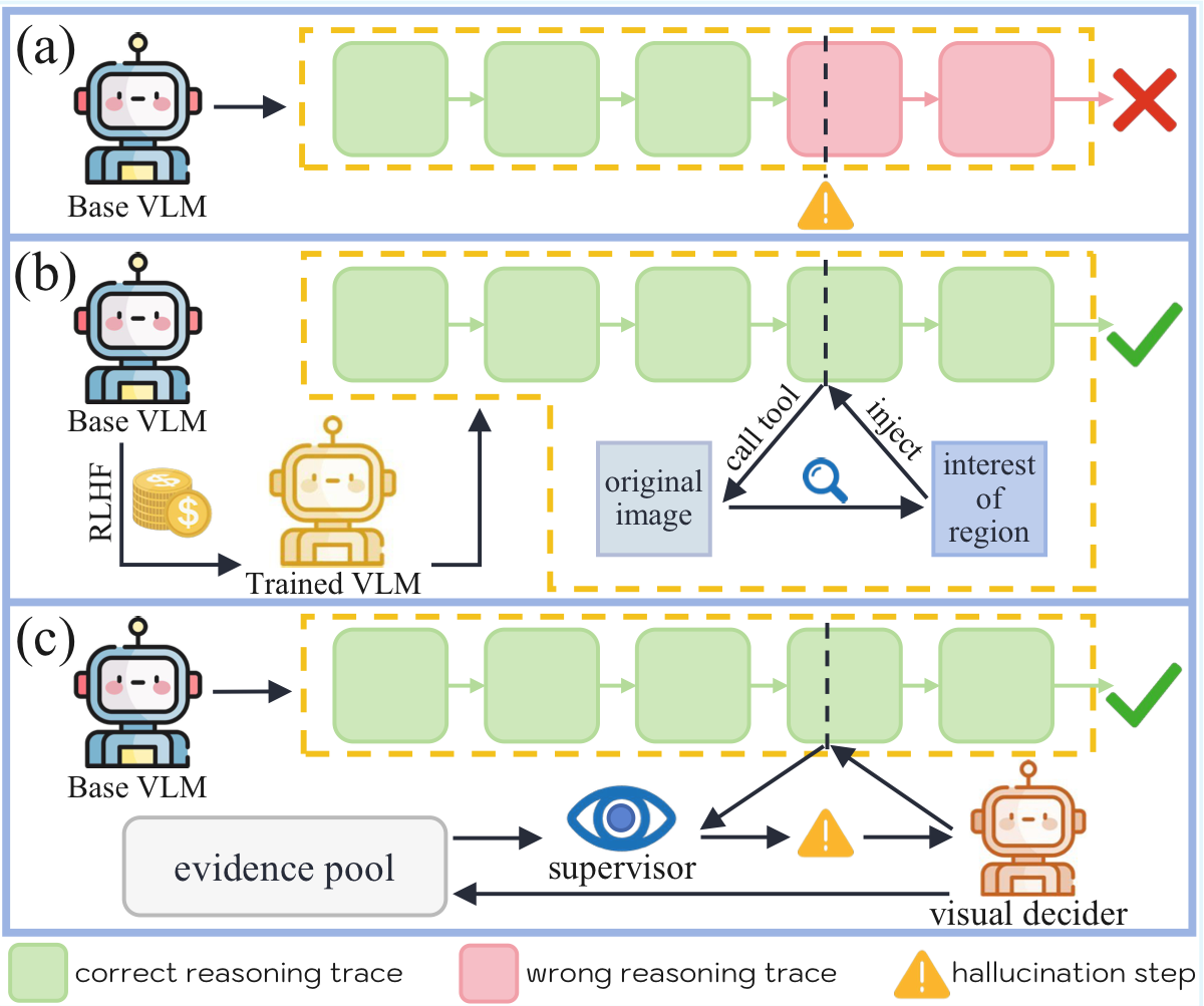 We propose an iterative, training-free, plug-and-play framework that supervises each reasoning step with visual evidence, improving reasoning accuracy while effectively reducing hallucination rates across different model scales.
